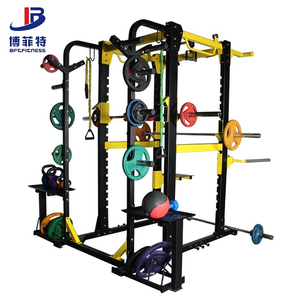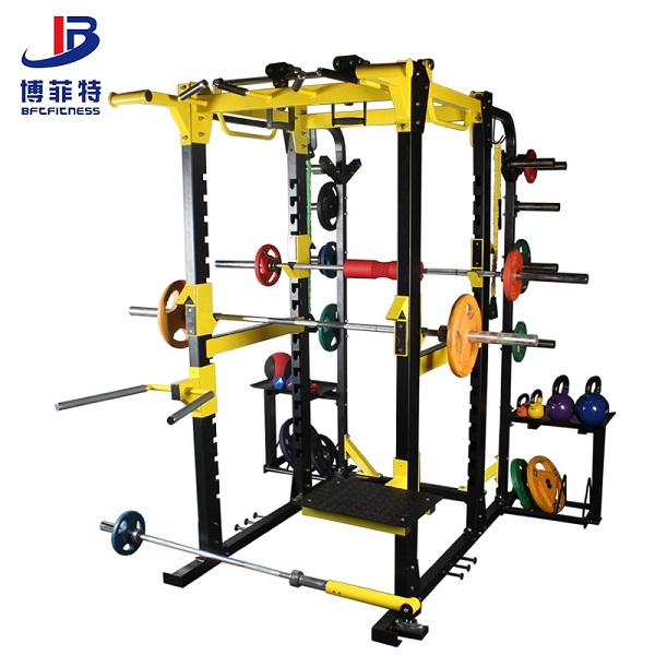 商用健身房大型深蹲架,专业多功能深蹲卧推综合向日葵视频网页版,组合向日葵视频在线观看污批发直销,模块化功能可定制,两侧有杠铃片架和置物托盘,可进行深蹲、卧推、T杠划船、双杠臂屈伸、跳板、引体向上等训练
